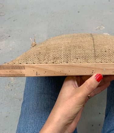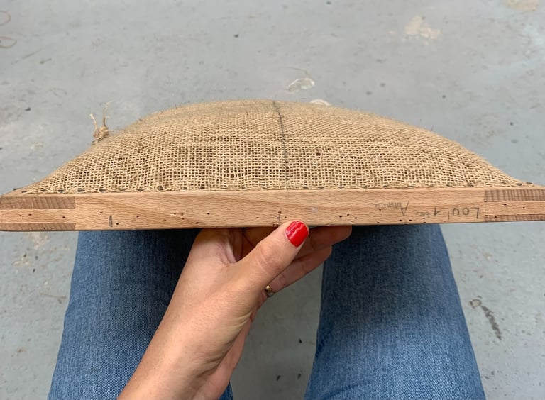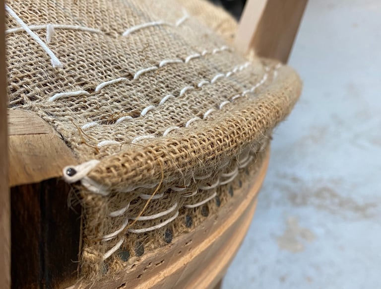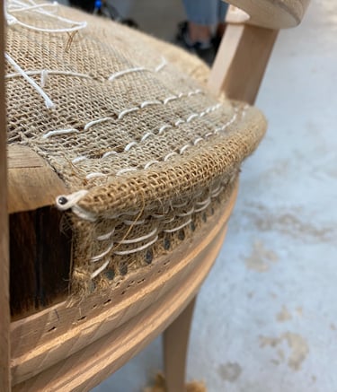 Les garnitures traditionnelles en crin sont connues pour durer dans le temps. Pour les réaliser il faut modeler le crin au travers des différentes toiles de jute à l’aide d’aiguilles courbes et de fil résistant. Chaque fil de la toile de jute fixé au siège compte. Le moindre écart de précision peut fausser toute la forme du siège. On sangle avec des bandes de jute le fond du siège dégarni au préalable. Ensuite, selon le siège et/ou le résultat demandé, on coud des ressorts adaptés. Ils ne sont pas nécessaires sur tous les sièges. On crée la forme du siège en tenant compte de l’époque du siège et de son style. Par exemple un siège Louis XV sera plutôt en courbes quand un siège Louis XVI demandera des lignes plutôt droites. La forme du bois nous guide.